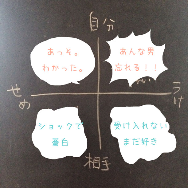 Grappsというサイトで毎週診断の連載をさせていただいてるんですが、今回は恋愛で未練が残る場合、タイプ別にどんなかなーというのを見てみました。ついでに必要ならばとアドバイスも。笑